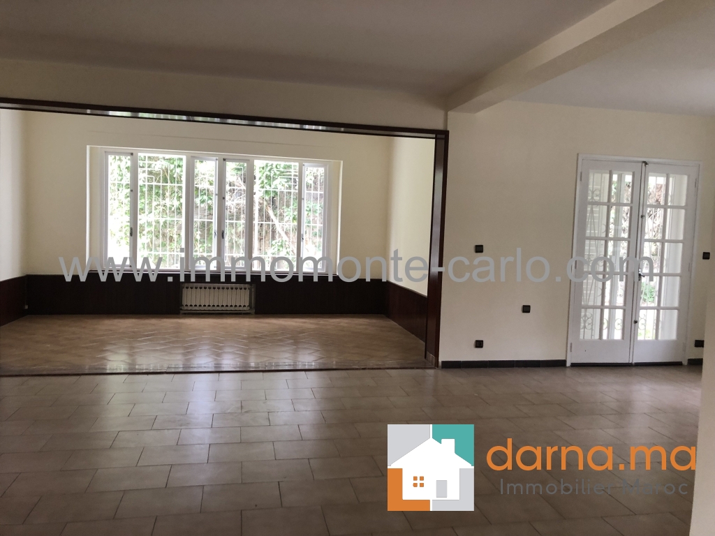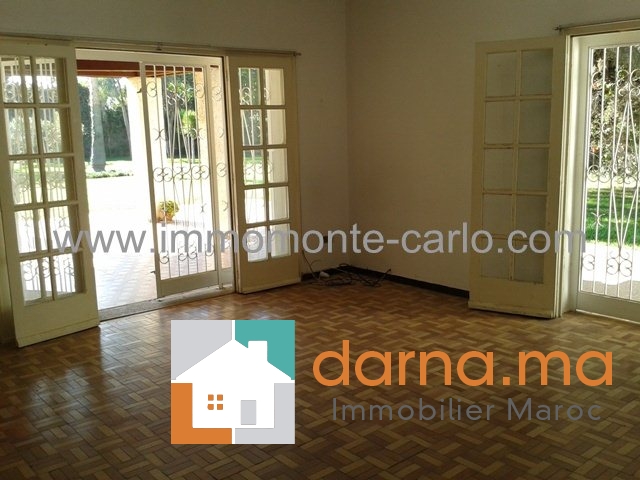 Location à Rabat villa de plain pied avec piscine sur un grand jardin à  Souissi,  villa sans vis-à-vis et de nombreuses ouvertures sur une belle grande terrasse donnant  le jardin et la piscine  exposée plein sud, avec chauffage central et climatisation dans toutes les pièces, composée de 4chambres dont un Master room avec dressing, 3salles de bain, 3 salons avec coin  cheminée, séjour, salle d’eau des invités, grande terrasse, cuisine, buanderie, débarras, logement de personnel, puit, grand garage…   Pour plus d’informations ou visite n’hésitez pas de contacter notre agence immobilière Immo Monte-Carlo au N° de tél: +212661464037/ +212661212547ou Tél/Fax: +212537755043 ou par E-mail : Cette adresse e-mail est protégée contre les robots spammeurs. Vous devez activer le JavaScript pour la visualiser. ou visitez notre site www.immomonte-carlo.com ou  rendez-vous au 15, Av. Al Abtal N°4, Agdal RABAT MAROC.